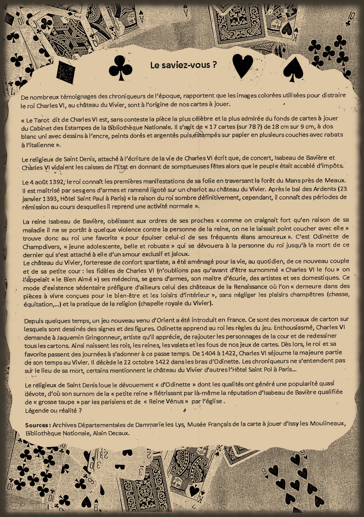 De nombreux témoignages des chroniqueurs de l'époque, rapportent que les images coloriées utilisées pour distraire le roi Charles VI, au château du Vivier, sont à l’origine de nos cartes à jouer…